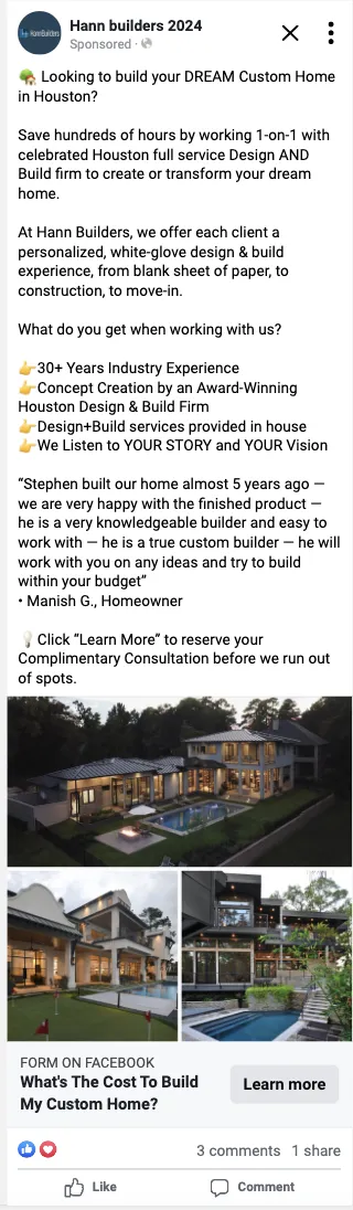 Hann Build had a solid online presence and was already handling their SEO in-house, but they needed a way to bring in more high-end leads for their new residential construction and remodeling projects.